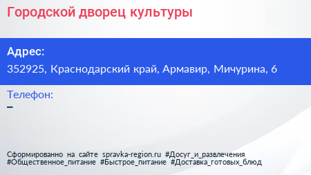 Городской дворец культуры по адресу 352925, Краснодарский край, Армавир, Мичурина, 6 в дальнейшем Организация, размещена в следующих категориях: