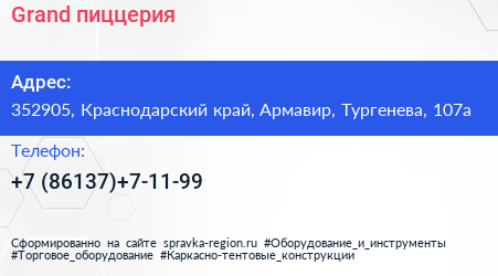 Grand, пиццерия по адресу 352905, Краснодарский край, Армавир, Тургенева, 107а в дальнейшем Организация, размещена в следующих категориях: