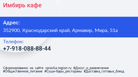 Имбирь, кафе по адресу 352900, Краснодарский край, Армавир, Мира, 51а в дальнейшем Организация, размещена в следующих категориях: