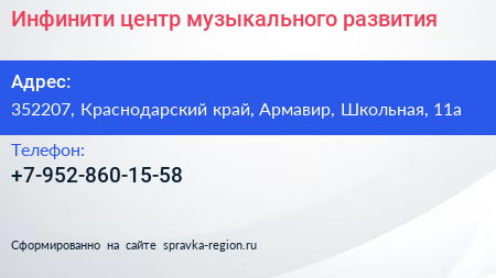 Инфинити, центр музыкального развития по адресу 352207, Краснодарский край, Армавир, Школьная, 11а в дальнейшем Организация, размещена в следующих категориях:
