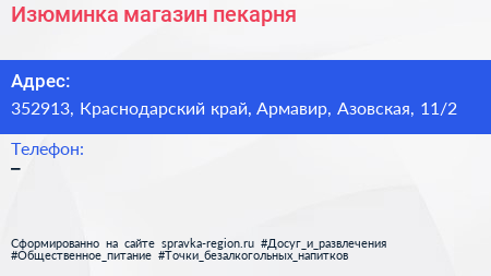 Изюминка, магазин-пекарня по адресу 352913, Краснодарский край, Армавир, Азовская, 11/2 в дальнейшем Организация, размещена в следующих категориях: