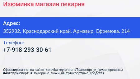 Изюминка, магазин-пекарня по адресу 352932, Краснодарский край, Армавир, Ефремова, 214 в дальнейшем Организация, размещена в следующих категориях: