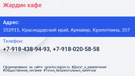 Жардин, кафе по адресу 352915, Краснодарский край, Армавир, Кропоткина, 357 в дальнейшем Организация, размещена в следующих категориях: