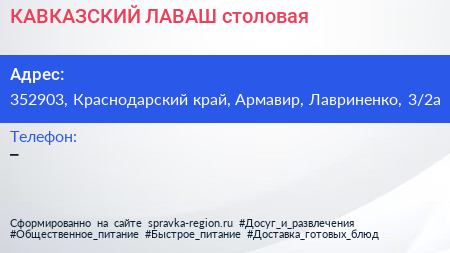 КАВКАЗСКИЙ ЛАВАШ, столовая по адресу 352903, Краснодарский край, Армавир, Лавриненко, 3/2а в дальнейшем Организация, размещена в следующих категориях:
