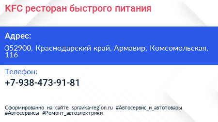 KFC, ресторан быстрого питания по адресу 352900, Краснодарский край, Армавир, Комсомольская, 116 в дальнейшем Организация, размещена в следующих категориях: