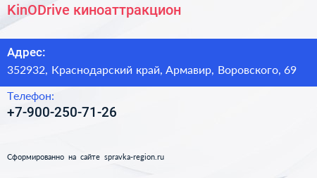 KinODrive, киноаттракцион по адресу 352932, Краснодарский край, Армавир, Воровского, 69 в дальнейшем Организация, размещена в следующих категориях: