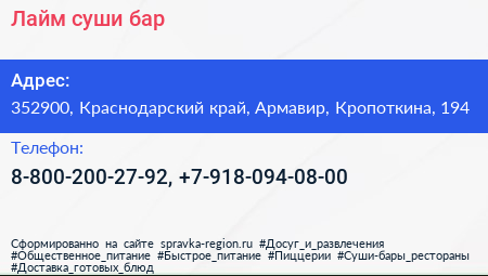 Лайм, суши-бар по адресу 352900, Краснодарский край, Армавир, Кропоткина, 194 в дальнейшем Организация, размещена в следующих категориях: