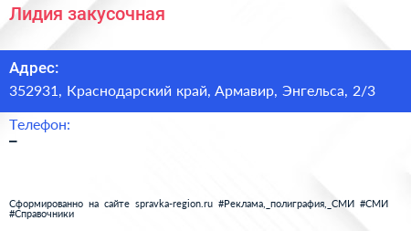 Лидия, закусочная по адресу 352931, Краснодарский край, Армавир, Энгельса, 2/3 в дальнейшем Организация, размещена в следующих категориях:
