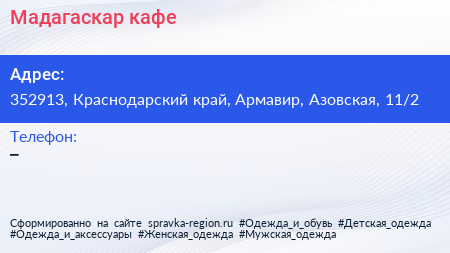 Мадагаскар, кафе по адресу 352913, Краснодарский край, Армавир, Азовская, 11/2 в дальнейшем Организация, размещена в следующих категориях: