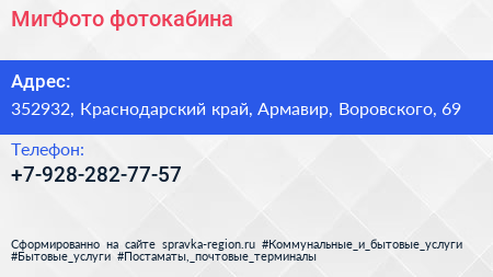 МигФото, фотокабина по адресу 352932, Краснодарский край, Армавир, Воровского, 69 в дальнейшем Организация, размещена в следующих категориях: