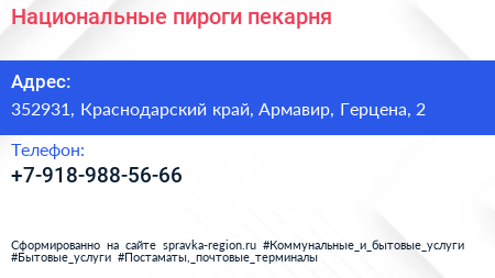 Национальные пироги, пекарня по адресу 352931, Краснодарский край, Армавир, Герцена, 2 в дальнейшем Организация, размещена в следующих категориях: