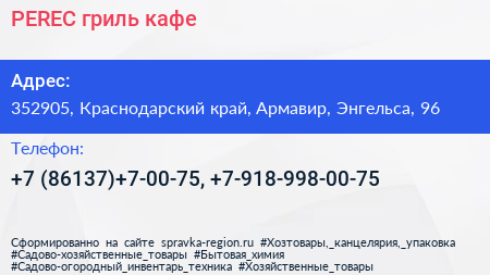 PEREC, гриль-кафе по адресу 352905, Краснодарский край, Армавир, Энгельса, 96 в дальнейшем Организация, размещена в следующих категориях: