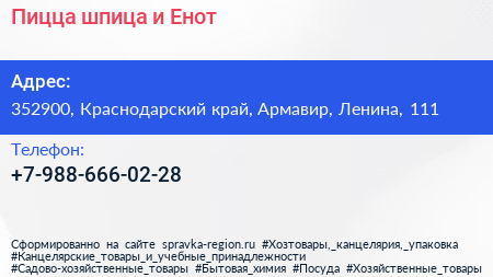 Пицца шпица и Енот по адресу 352900, Краснодарский край, Армавир, Ленина, 111 в дальнейшем Организация, размещена в следующих категориях: