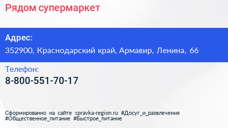 Рядом, супермаркет по адресу 352900, Краснодарский край, Армавир, Ленина, 66 в дальнейшем Организация, размещена в следующих категориях: