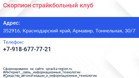 Скорпион, страйкбольный клуб по адресу 352916, Краснодарский край, Армавир, Тоннельная, 30/7 в дальнейшем Организация, размещена в следующих категориях: