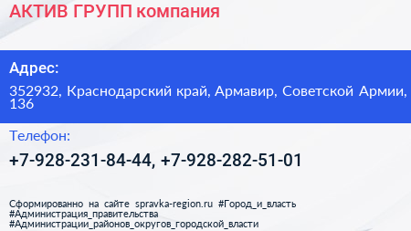 АКТИВ ГРУПП, компания по адресу 352932, Краснодарский край, Армавир, Советской Армии, 136 в дальнейшем Организация, размещена в следующих категориях: