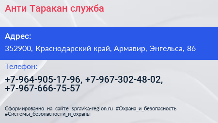 Анти Таракан, служба по адресу 352900, Краснодарский край, Армавир, Энгельса, 86 в дальнейшем Организация, размещена в следующих категориях: