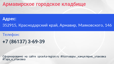 Армавирское городское кладбище по адресу 352915, Краснодарский край, Армавир, Маяковского, 146 в дальнейшем Организация, размещена в следующих категориях: