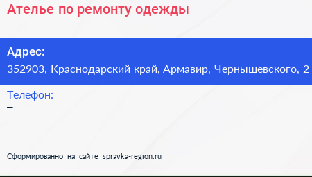 Ателье по ремонту одежды по адресу 352903, Краснодарский край, Армавир, Чернышевского, 2 в дальнейшем Организация, размещена в следующих категориях: