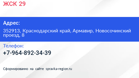 ЖСК-29 по адресу 352913, Краснодарский край, Армавир, Новосочинский проезд, 8 в дальнейшем Организация, размещена в следующих категориях: