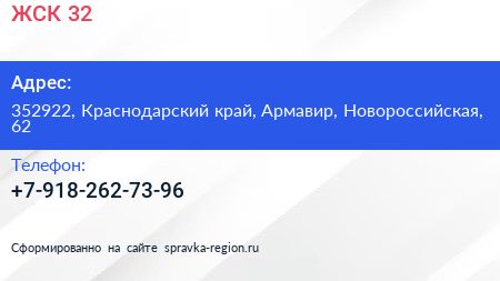 ЖСК №32 по адресу 352922, Краснодарский край, Армавир, Новороссийская, 62 в дальнейшем Организация, размещена в следующих категориях: