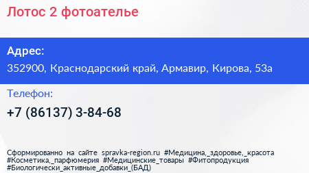 Лотос-2, фотоателье по адресу 352900, Краснодарский край, Армавир, Кирова, 53а в дальнейшем Организация, размещена в следующих категориях: