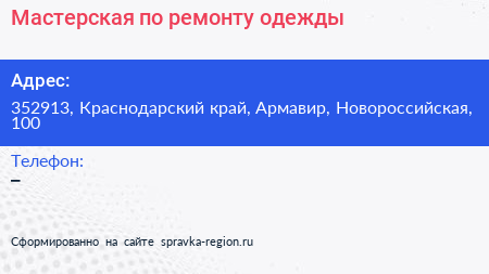 Мастерская по ремонту одежды по адресу 352913, Краснодарский край, Армавир, Новороссийская, 100 в дальнейшем Организация, размещена в следующих категориях:
