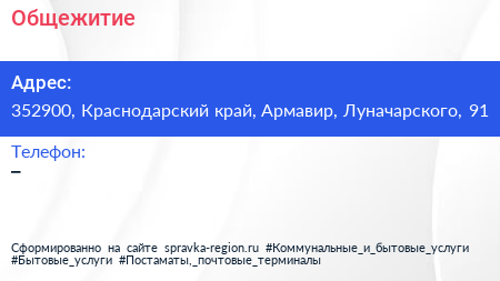 Общежитие по адресу 352900, Краснодарский край, Армавир, Луначарского, 91 в дальнейшем Организация, размещена в следующих категориях: