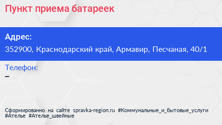 Пункт приема батареек по адресу 352900, Краснодарский край, Армавир, Песчаная, 40/1 в дальнейшем Организация, размещена в следующих категориях: