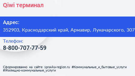 Qiwi, терминал по адресу 352903, Краснодарский край, Армавир, Луначарского, 307 в дальнейшем Организация, размещена в следующих категориях: