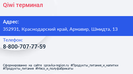 Qiwi, терминал по адресу 352931, Краснодарский край, Армавир, Шмидта, 13 в дальнейшем Организация, размещена в следующих категориях: