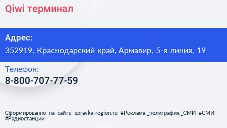 Qiwi, терминал по адресу 352919, Краснодарский край, Армавир, 5-я линия, 19 в дальнейшем Организация, размещена в следующих категориях: