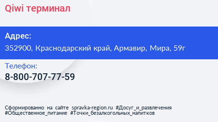 Qiwi, терминал по адресу 352900, Краснодарский край, Армавир, Мира, 59г в дальнейшем Организация, размещена в следующих категориях: