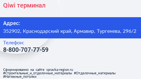 Qiwi, терминал по адресу 352902, Краснодарский край, Армавир, Тургенева, 296/2 в дальнейшем Организация, размещена в следующих категориях: