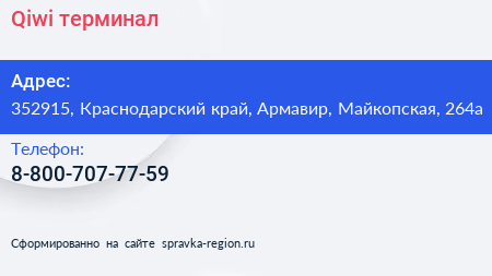 Qiwi, терминал по адресу 352915, Краснодарский край, Армавир, Майкопская, 264а в дальнейшем Организация, размещена в следующих категориях: