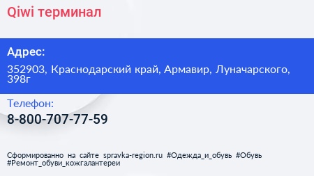 Qiwi, терминал по адресу 352903, Краснодарский край, Армавир, Луначарского, 398г в дальнейшем Организация, размещена в следующих категориях: