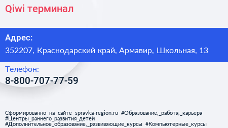 Qiwi, терминал по адресу 352207, Краснодарский край, Армавир, Школьная, 13 в дальнейшем Организация, размещена в следующих категориях: