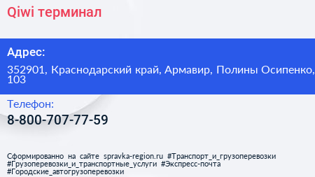 Qiwi, терминал по адресу 352901, Краснодарский край, Армавир, Полины Осипенко, 103 в дальнейшем Организация, размещена в следующих категориях: