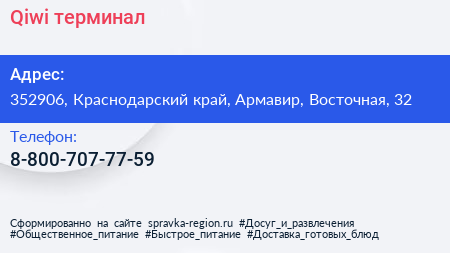 Qiwi, терминал по адресу 352906, Краснодарский край, Армавир, Восточная, 32 в дальнейшем Организация, размещена в следующих категориях:
