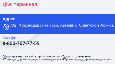Qiwi, терминал по адресу 352932, Краснодарский край, Армавир, Советской Армии, 128 в дальнейшем Организация, размещена в следующих категориях:
