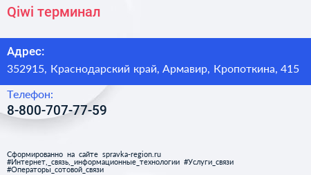 Qiwi, терминал по адресу 352915, Краснодарский край, Армавир, Кропоткина, 415 в дальнейшем Организация, размещена в следующих категориях: