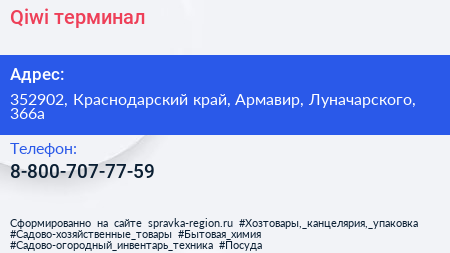 Qiwi, терминал по адресу 352902, Краснодарский край, Армавир, Луначарского, 366а в дальнейшем Организация, размещена в следующих категориях: