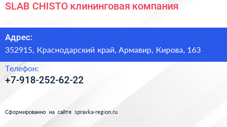 SLAB CHISTO, клининговая компания по адресу 352915, Краснодарский край, Армавир, Кирова, 163 в дальнейшем Организация, размещена в следующих категориях: