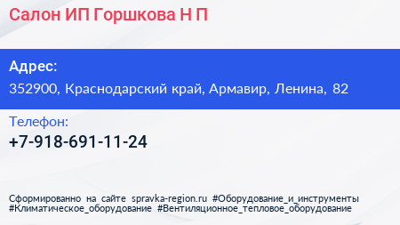Салон, ИП Горшкова Н.П. по адресу 352900, Краснодарский край, Армавир, Ленина, 82 в дальнейшем Организация, размещена в следующих категориях: