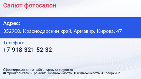 Салют, фотосалон по адресу 352900, Краснодарский край, Армавир, Кирова, 47 в дальнейшем Организация, размещена в следующих категориях: