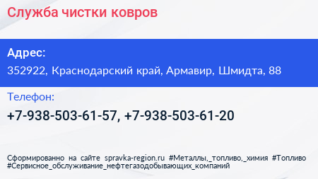 Служба чистки ковров по адресу 352922, Краснодарский край, Армавир, Шмидта, 88 в дальнейшем Организация, размещена в следующих категориях: