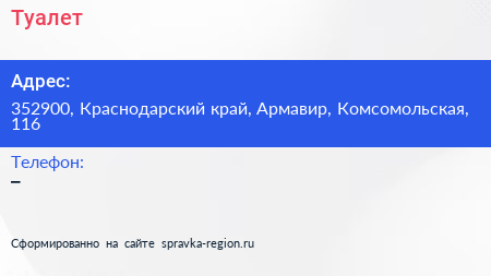 Туалет по адресу 352900, Краснодарский край, Армавир, Комсомольская, 116 в дальнейшем Организация, размещена в следующих категориях: