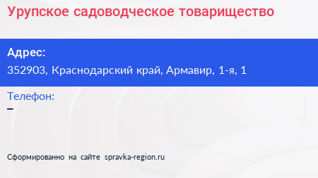 Урупское, садоводческое товарищество по адресу 352903, Краснодарский край, Армавир, 1-я, 1 в дальнейшем Организация, размещена в следующих категориях: