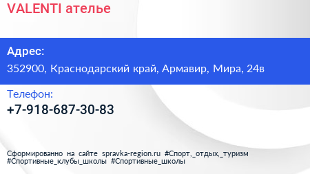 VALENTI, ателье по адресу 352900, Краснодарский край, Армавир, Мира, 24в в дальнейшем Организация, размещена в следующих категориях: