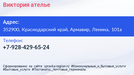 Виктория, ателье по адресу 352900, Краснодарский край, Армавир, Ленина, 101а в дальнейшем Организация, размещена в следующих категориях: